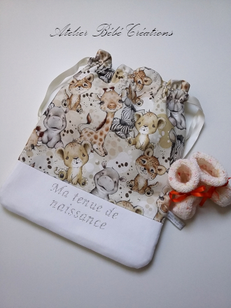 Cadeau de naissance, gender reveal ou baby shower, ce magnifique pochon en tissu Premium vous servira pour apporter la toute 1ère tenue de bébé en salle d’accouchement